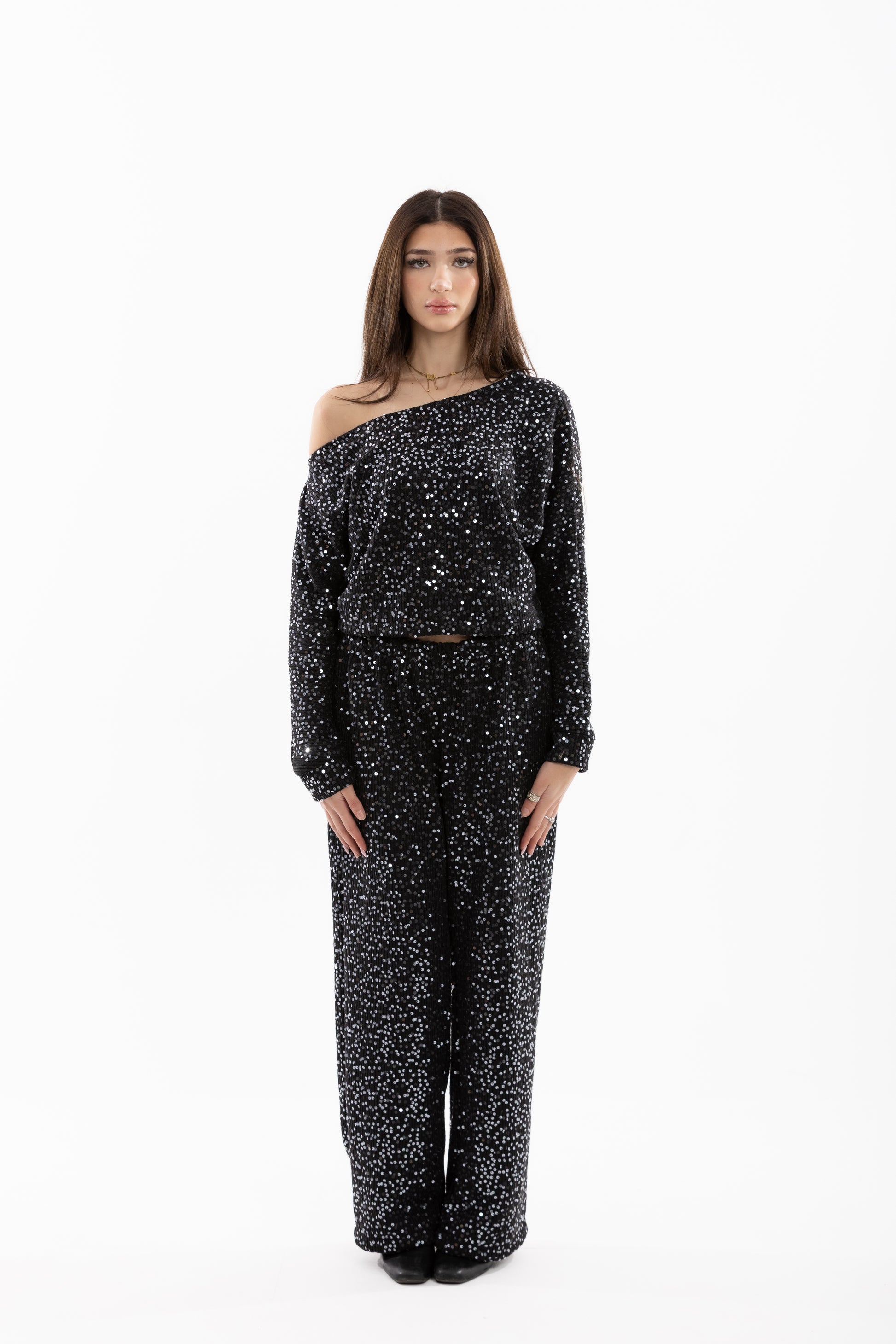A SET CONSISTS OF a slightly baggy pants and a off shoulder cropped loose long sleeve shirt with attention to all the details and top notch quality made off a special fabric in black