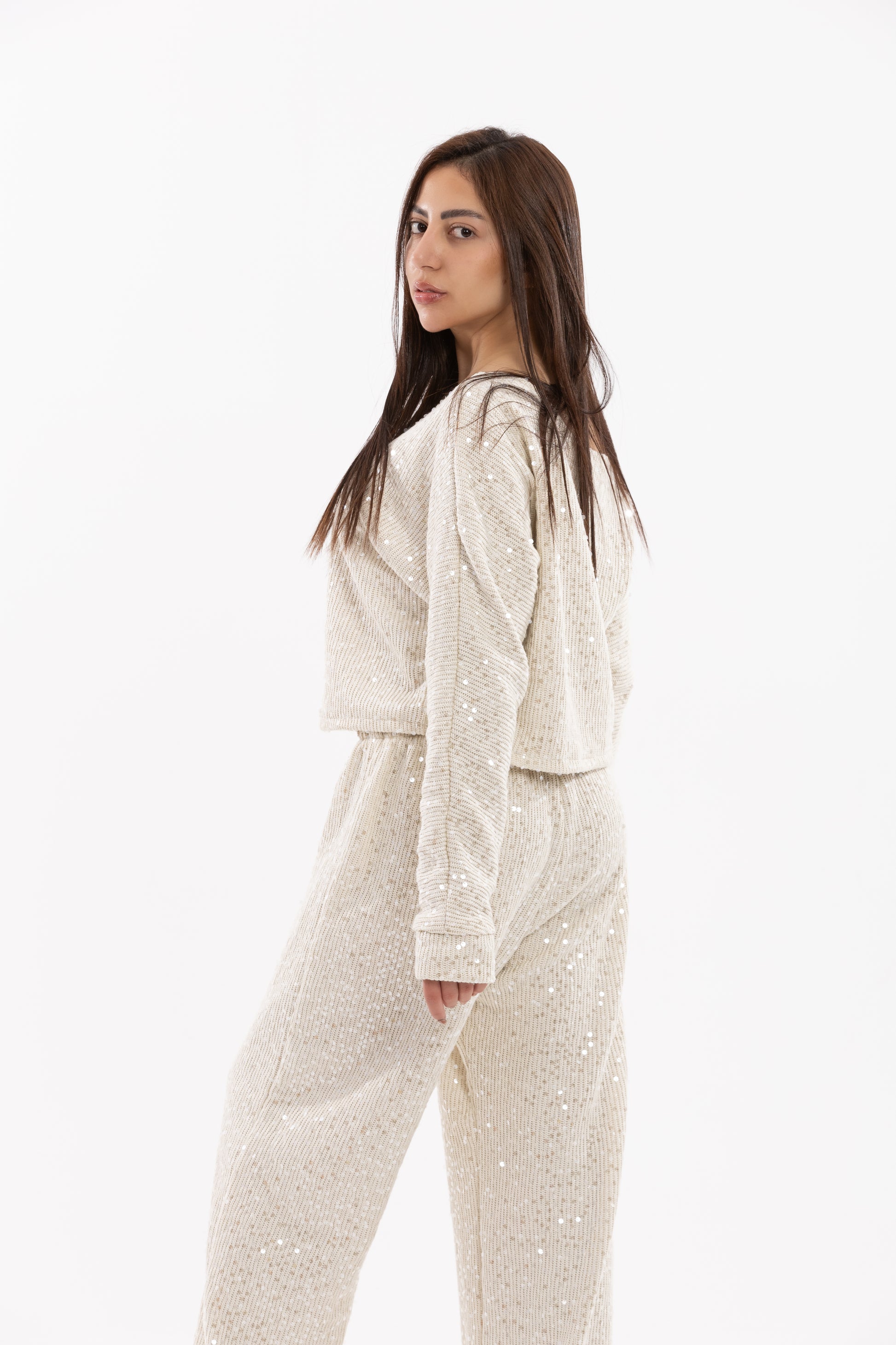 A SET CONSISTS OF a slightly baggy pants and a off shoulder cropped loose long sleeve shirt with attention to all the details and top notch quality made off a special fabric in beige